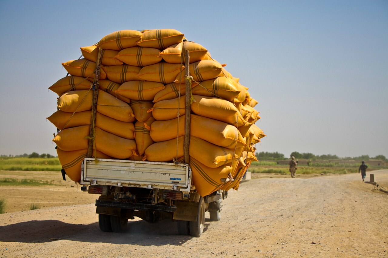 A truck carrying thousands of pounds of processed wheat rolls goes by in Helmland province. Persuading farmers to swtich to legal crops is tough when the profits available from poppy cultivation are so much higher (Credit: Cpl. Marco Mancha, USMC, cc, ID 110719-M-PE262-373).
