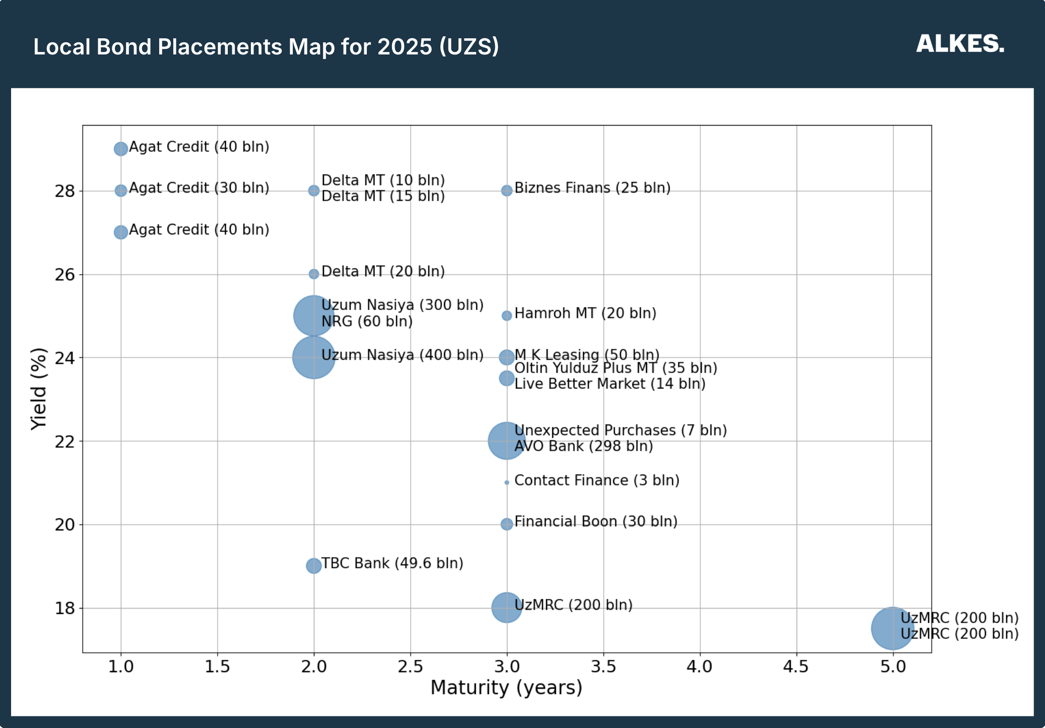 The National Bank of Uzbekistan, the country’s largest bank with 100% state ownership, placed $418mn in two tranches: $300mn for five years at 7.2%, and UZS 1.5tn (equals to circa USD 118m) for three years at 17.95%. Demand exceeded $1.3bn, allowing the bank to cut coupons versus its previous issues by 130 basis points in dollars (from 8.5% to 7.2%) and by 192.5 basis points in UZS (from 19.875% to 17.95%). For a systemically important bank of this size, this became a clear signal that the market has started to reassess Uzbekistan’s sovereign and quasi-sovereign risk.