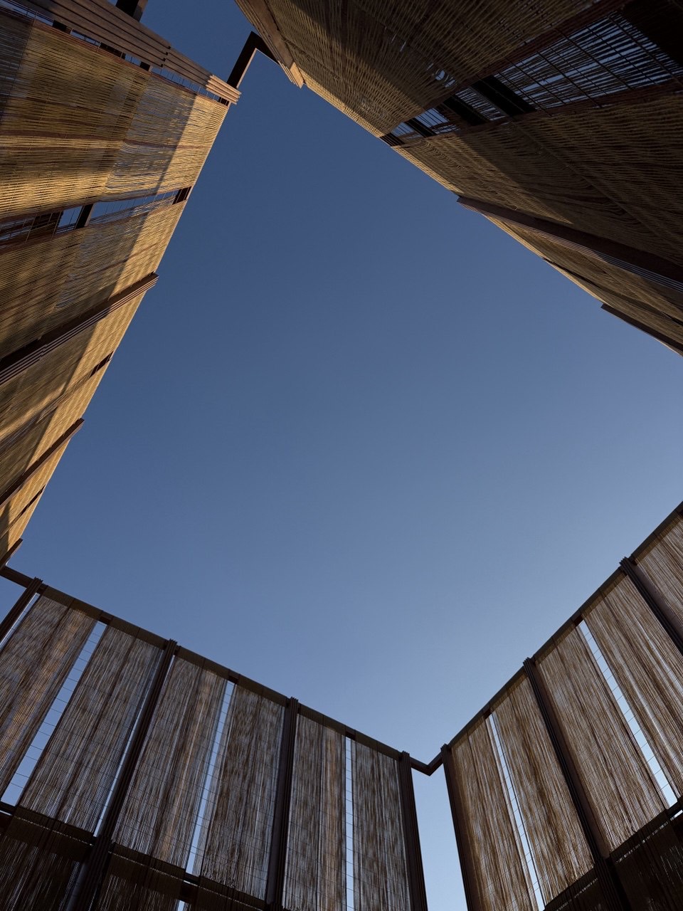 The design was inspired by Islamic spatial typologies, courtyards, shade and communal gathering zones and interprets the act of weaving as both a metaphor and a construction method.