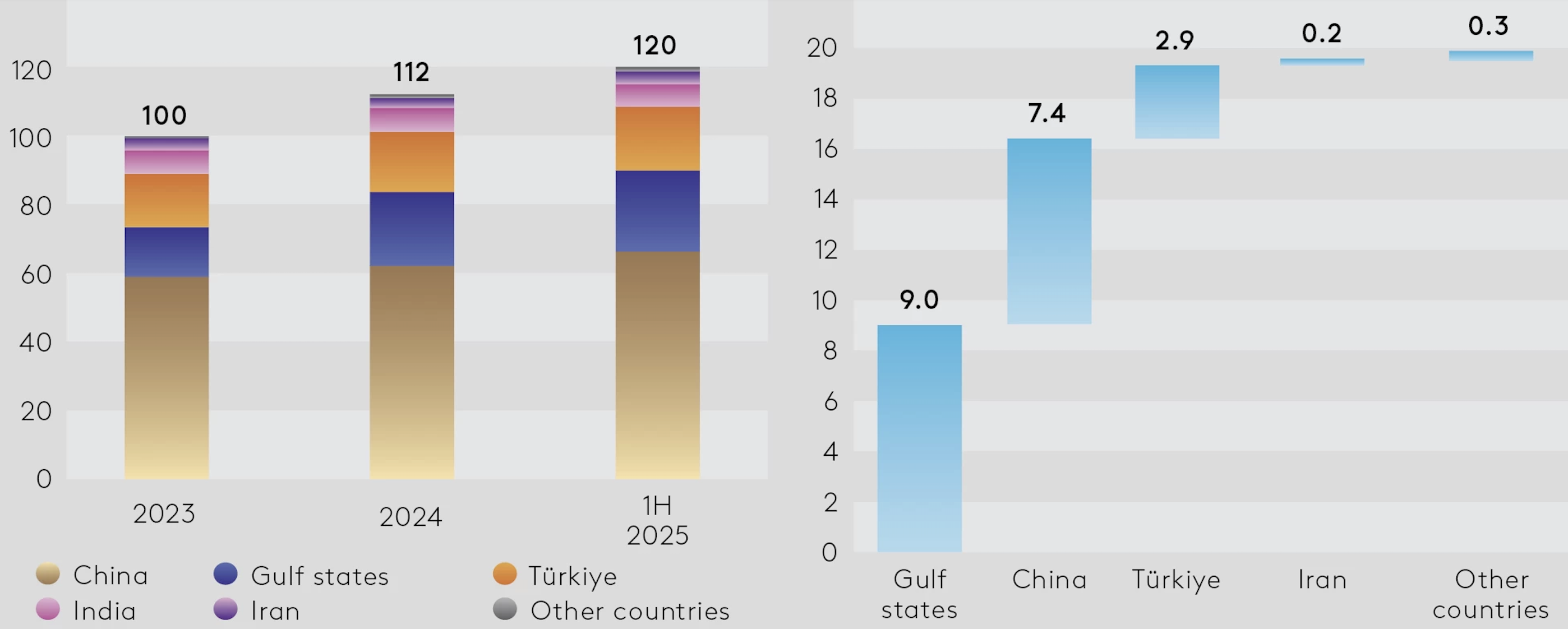 Almost all of the capital came from a handful of Asian economies. China remains the largest single investor, with $66.1bn, or 55% of total Asian FDI stock in the Eurasian region. It is followed by the Gulf states with $23.9bn (20%), Turkey with $12.3bn (15.5%), and India with $6.8bn (5.7%). Together, the four countries account for around 96% of all Asian investment in the region.