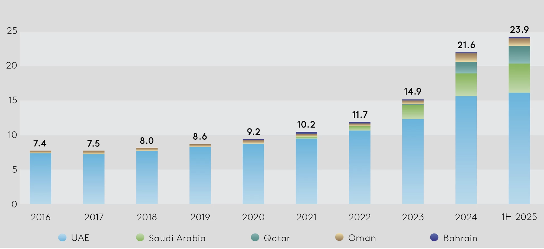Among Gulf investors, the United Arab Emirates (UAE) is by far the largest player, with $16.1bn in investment stock, representing 68% of the Gulf total. It is followed by Saudi Arabia with $4.2bn (18%), Qatar with $2.4bn (10%), and Oman with $1.1bn (5%).