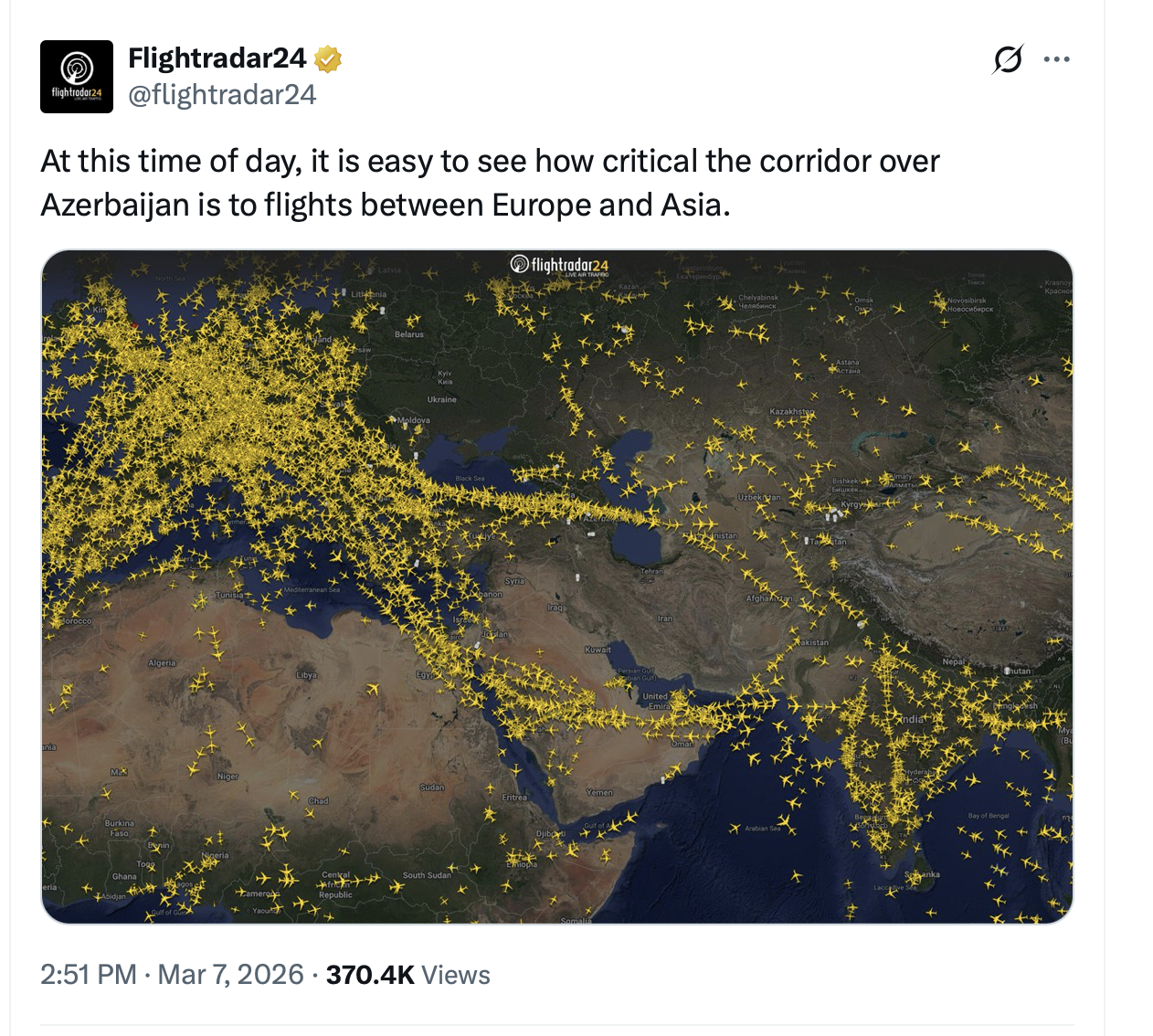 While southern Azerbaijani airspace was closed, the remaining open corridor across the country’s north became a vital corridor for aircraft travelling between Europe and Asia.