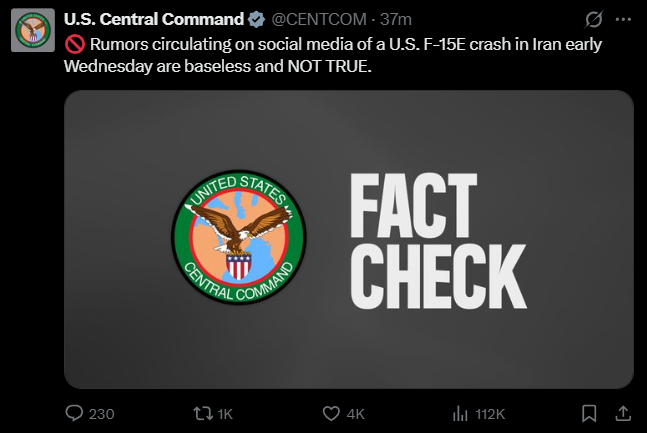 US Central Command (CENTCOM) denied Iranian claims that its forces shot down a US Air Force F-15E Strike Eagle fighter jet, calling the reports "baseless and not true," the command posted on X on March 5.