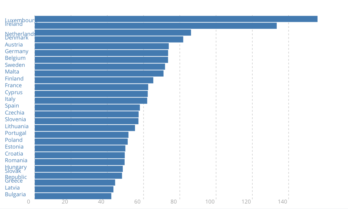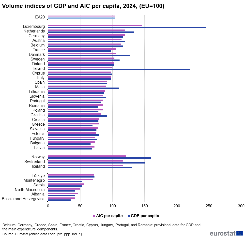 Eurostat GDP per capita data shows a similar picture, as does Actual Individual Consumption (AIC) per capita data, used to compare the relative welfare of consumers across countries, from the EU’s statistics office.