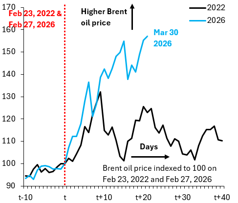 "The blue line shows the rise in Brent since the start of hostilities — up 60%," he notes. "The black line is the rise in Brent on a similar time scale back in 2022 — up 20%." The ratio, he contends, is broadly consistent with the relative size of each supply shock. That is why, he argues, the more alarming forecasts calling for $150 or even $200 a barrel lack a sound analytical foundation: "Markets are pricing the greater order of magnitude of this shock correctly, so it's far from obvious why Brent should go to $150 or $200."