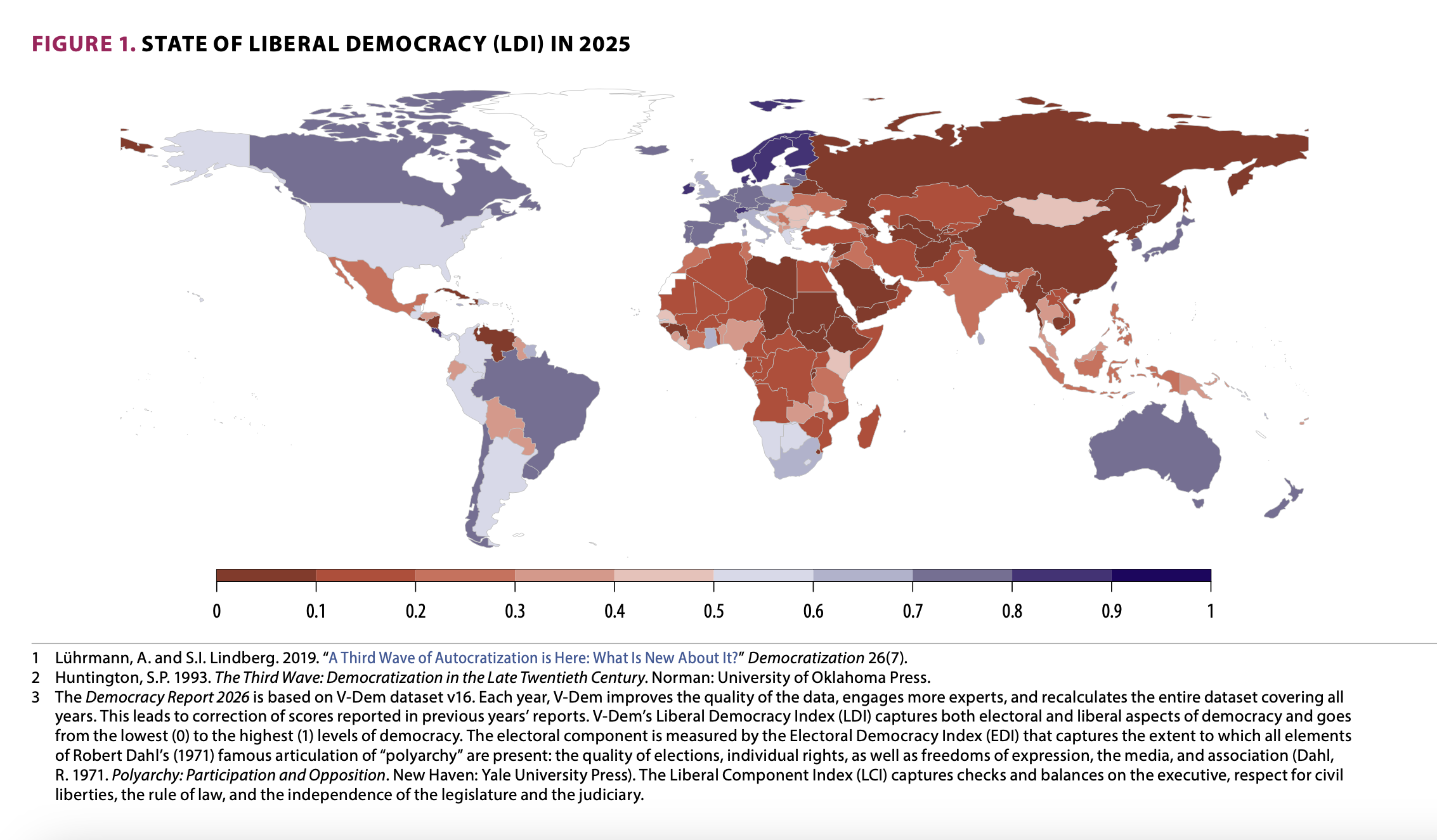 The 2026 report, authored by Professor Staffan I Lindberg and colleagues, shows that nearly a quarter of the world’s nations are undergoing autocratisation, with six of ten new autocratising countries in Europe and North America, including Italy, the United Kingdom, and the United States.