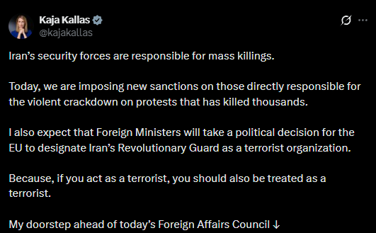 She had also posted on social media platform X (previously Twitter): "Iran’s security forces are responsible for mass killings. Today, we are imposing new sanctions on those directly responsible for the violent crackdown on protests that has killed thousands. I also expect that Foreign Ministers will take a political decision for the EU to designate Iran’s Revolutionary Guard as a terrorist organization. Because, if you act as a terrorist, you should also be treated as a terrorist."