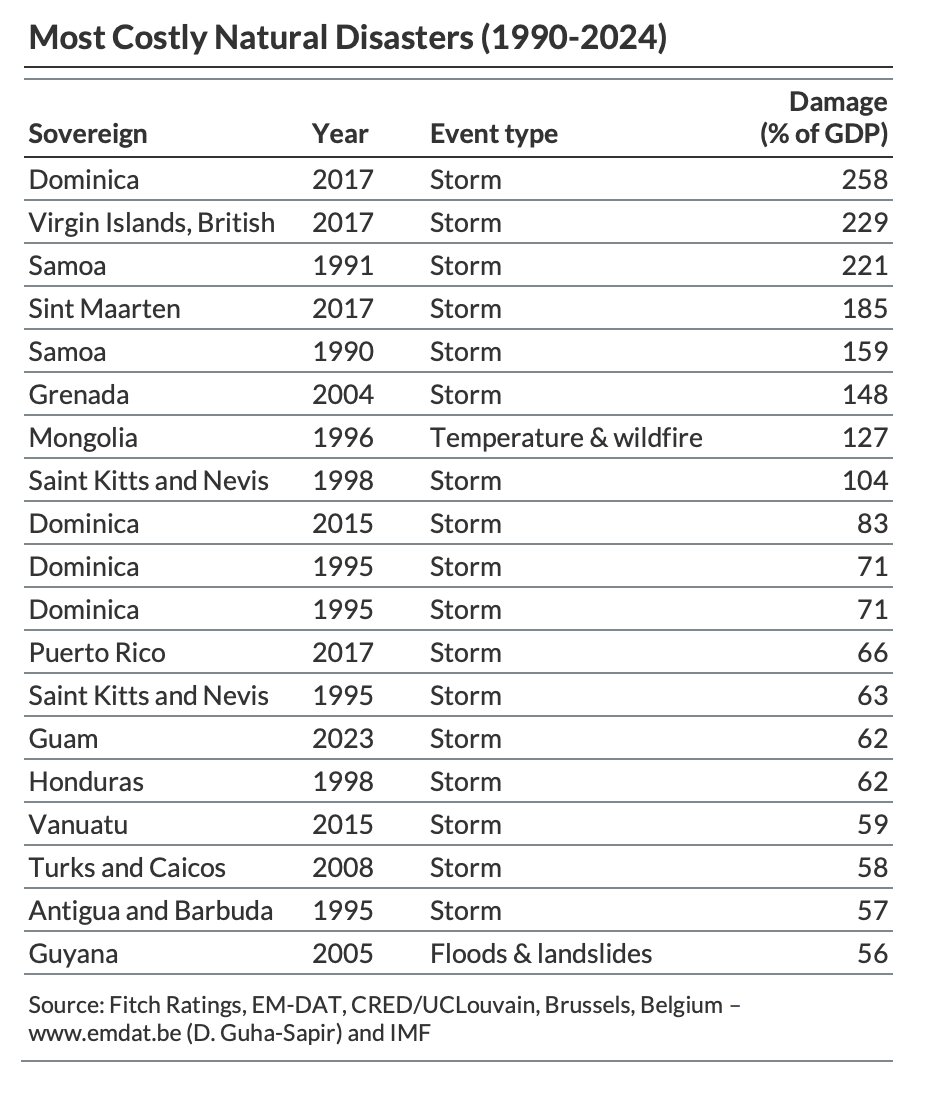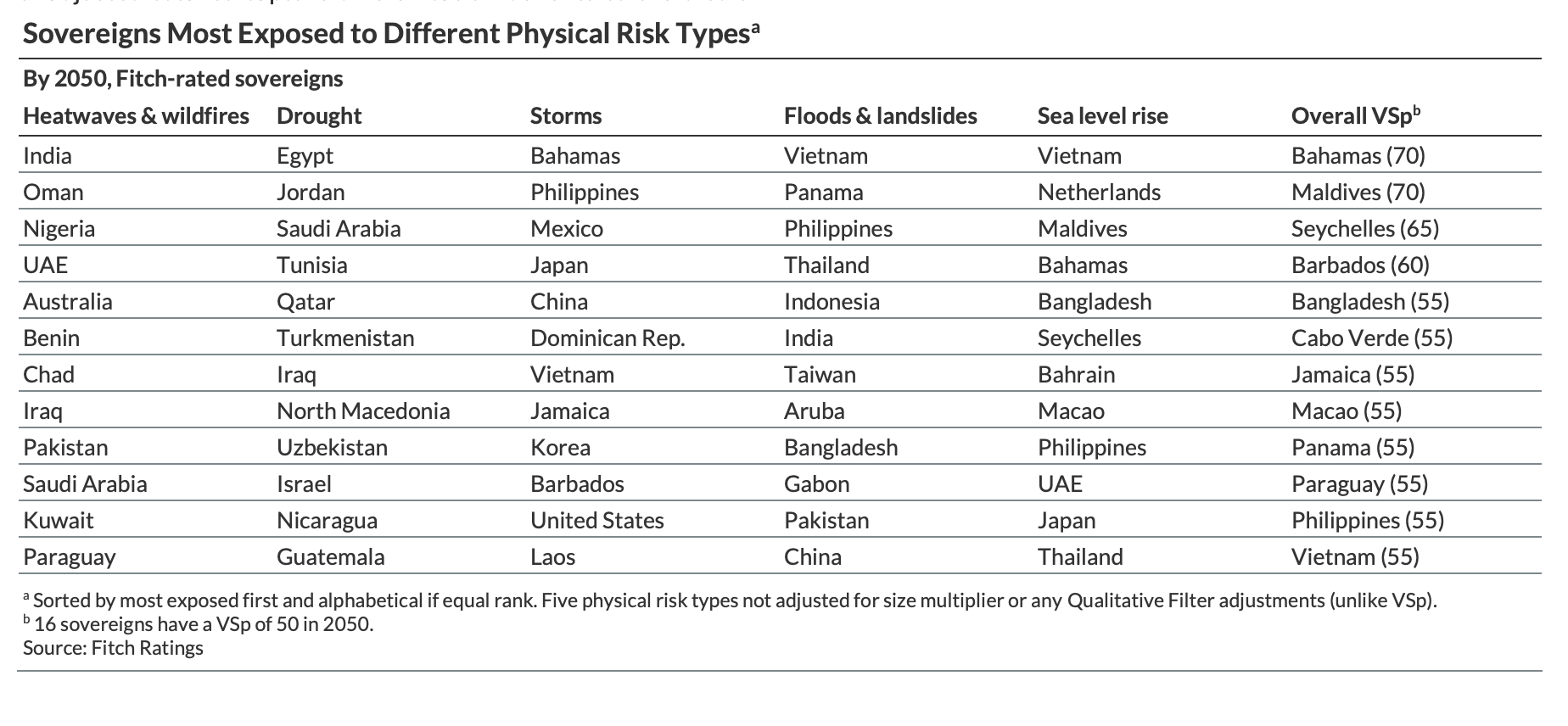 Although sovereign ratings have so far been “resilient to climate-related events,” Fitch indicated that this resilience may weaken as frequency and severity increase. “Rating downgrades are more likely where exposure is high and policy responses are insufficient or delayed.”