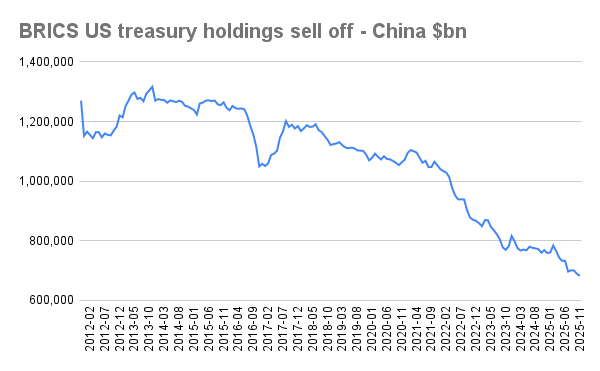 US Treasury TIC data on “Major Foreign Holders” show China’s peak holding of treasury bills at $1.316 trillion in November 2013, slipping to $682.6bn by November 2025 - a decline of roughly half over 12 years.
