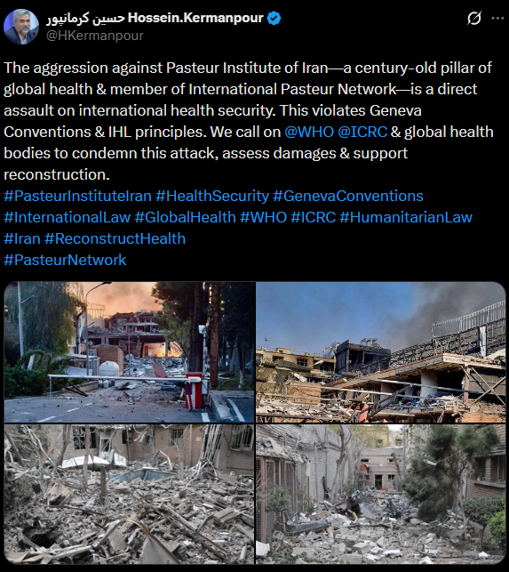 "The aggression against Pasteur Institute of Iran—a century-old pillar of global health & member of International Pasteur Network—is a direct assault on international health security," Health ministry official Hossein Kermanpour wrote on social media.