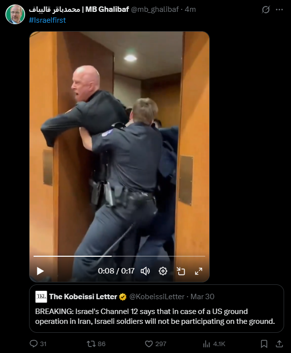 Ghalibaf posted the video with the hashtag "#Israelfirst" and quoted a post from The Kobeissi Letter citing Israel's Channel 12 as reporting that Israeli soldiers would not participate in any US ground operation in Iran.
