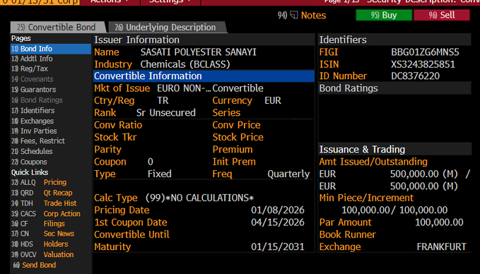 Sasa Polyester (SASA), a Borsa Istanbul-listed textile materials producer, has sold €415mn of a convertible eurobond (XS3243825851) due 2031 at a coupon rate and yield-to-investor of 4.75% (priced at 100), the company said on January 8.