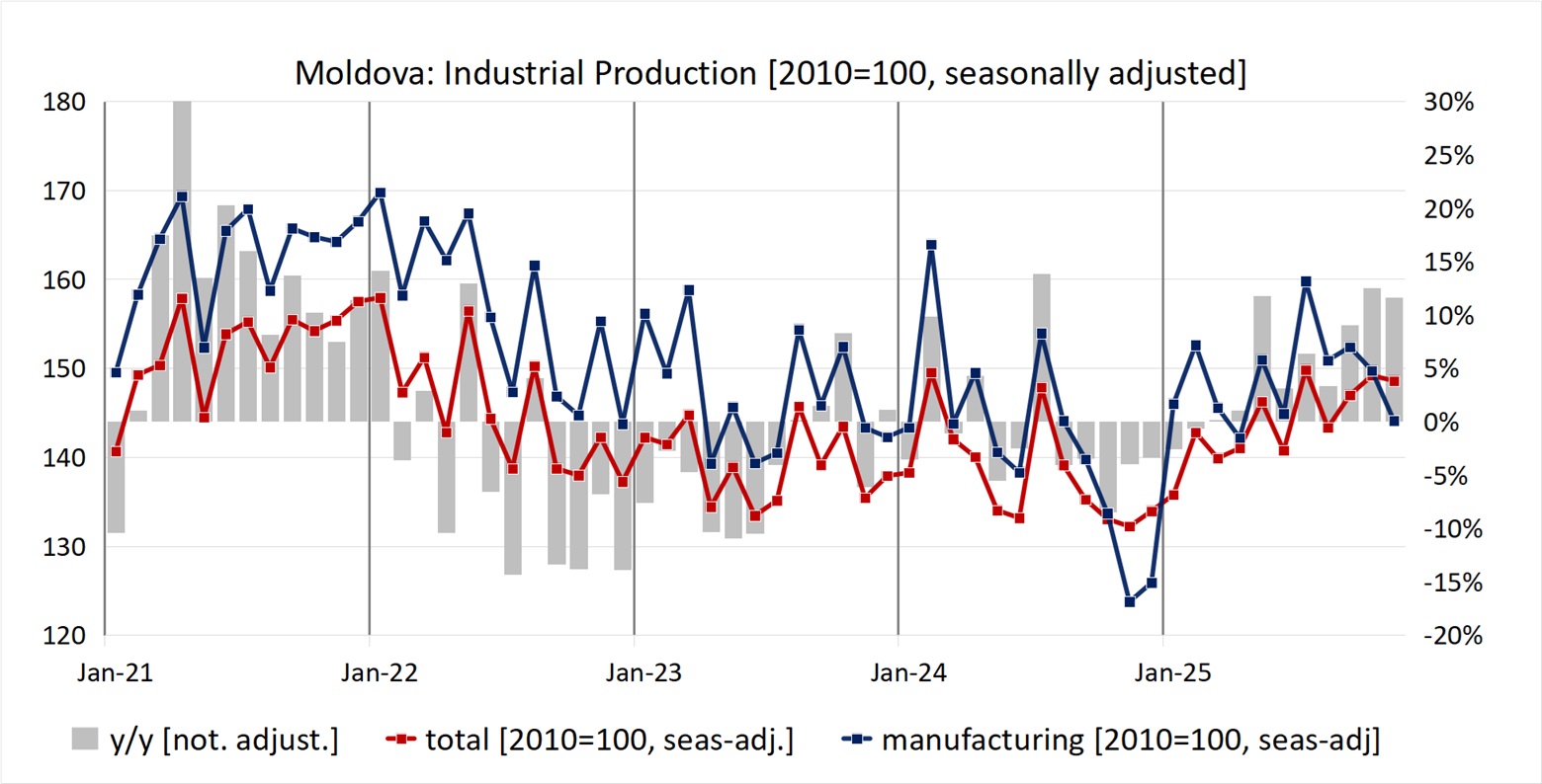 Moldova’s industrial production index (chart) increased by 11.6% y/y in November 2025 and by 4.5% y/y over the 12 months to November, according to data published by the statistics bureau BNS.
