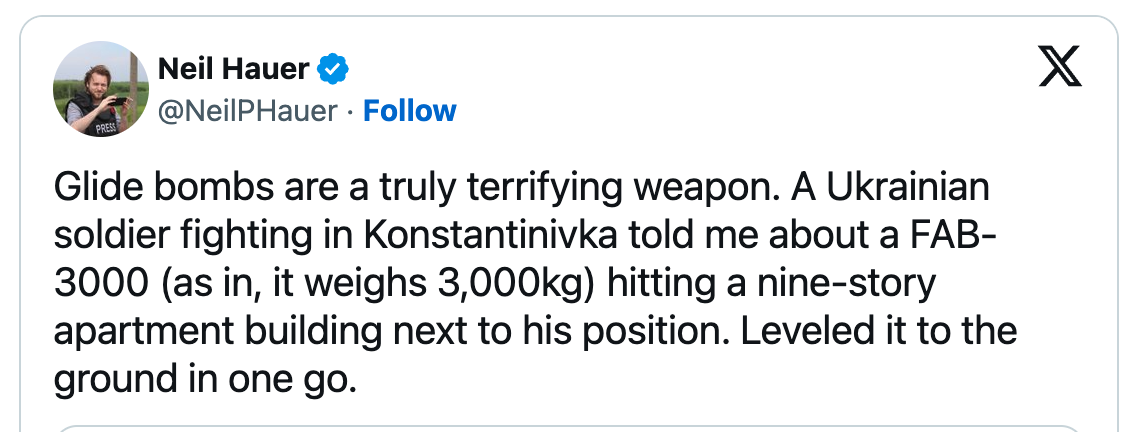"Glide bombs are a truly terrifying weapon," Canadian journalist Neil Hauer explained. He recalled a story about 3,000kg glide bombs striking an apartment building in Kostiantynivka, in eastern Ukraine. "Levelled it to the ground in one go," Hauer wrote.