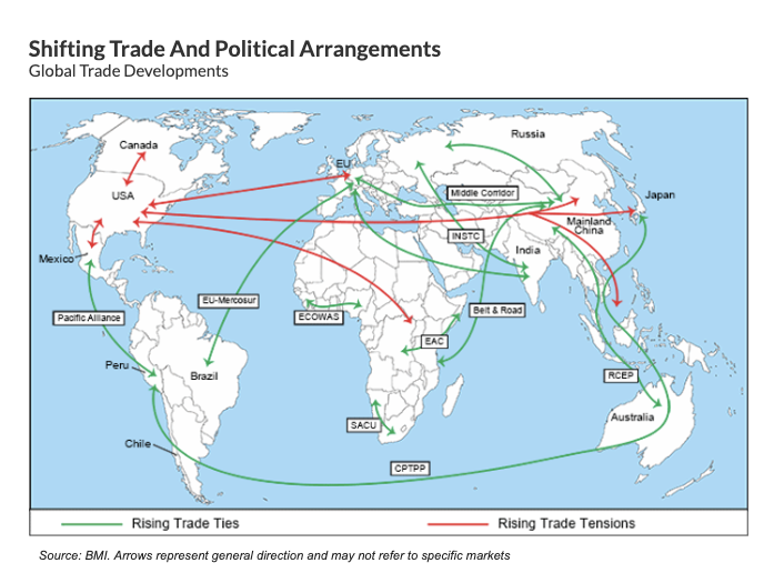 Entering 2026, trade tensions are rising between the US and its partners, while trade is on the increase within partnerships and blocs that do not include Washington, as set out in a map shared by analysts from research firm BMI in a recent webinar.
