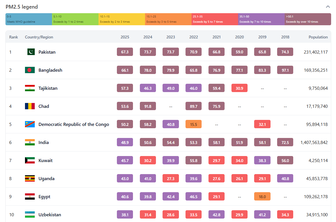 (Ranking based on annual average PM2.5 concentrations (μg/m³). PM2.5 refers to fine particulate matter air pollution that is 2.5 micrometres or less in diameter, in other words, small enough to enter deep into the lungs and bloodstream).