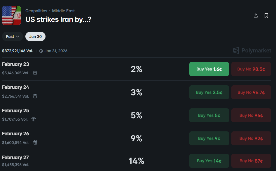 Odds rise steadily through the week, reaching 3% for February 24, 6% for February 25 and 9% for February 26, the date on which Iran and the United States are scheduled to hold a fresh round of nuclear talks in Geneva.