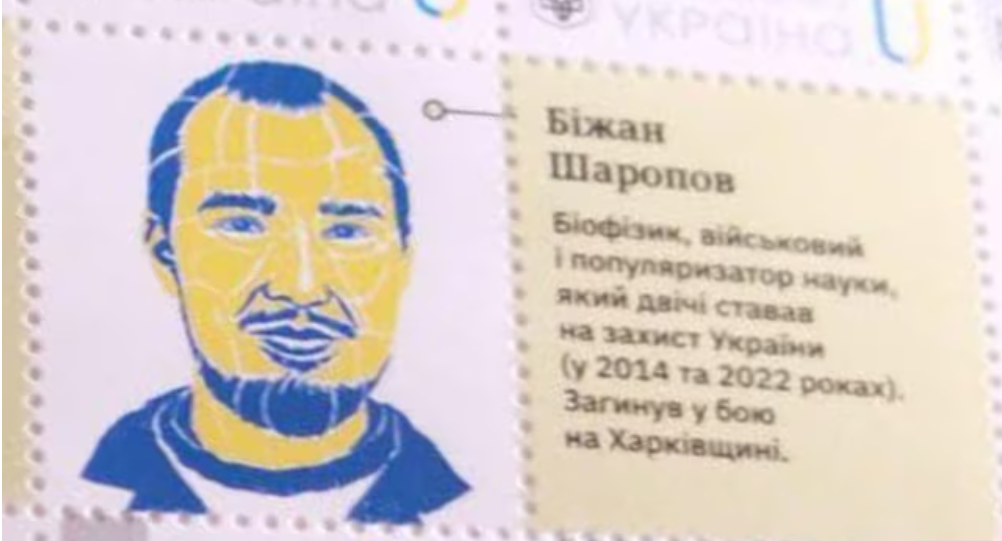 New Ukrainian postage stamp bearing a picture of scientist and Tajik native Bezhan Sharofov, who was killed while fighting against the Russian invasion of Ukraine (Credit: Ukrposhta, social media).