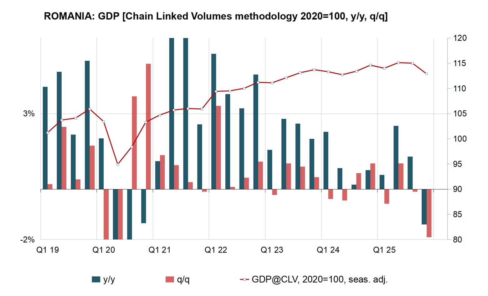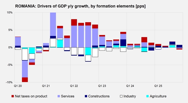 The growth episodes were concentrated in the middle of the year. According to the national statistics office's methodology, economic activity expanded mainly in the third quarter (+1.7% y/y), following the political stabilisation in July. Under the chain-linked methodology used by Eurostat, growth was recorded in both the second and third quarters (+2.5% y/y and +1.3% y/y, respectively).