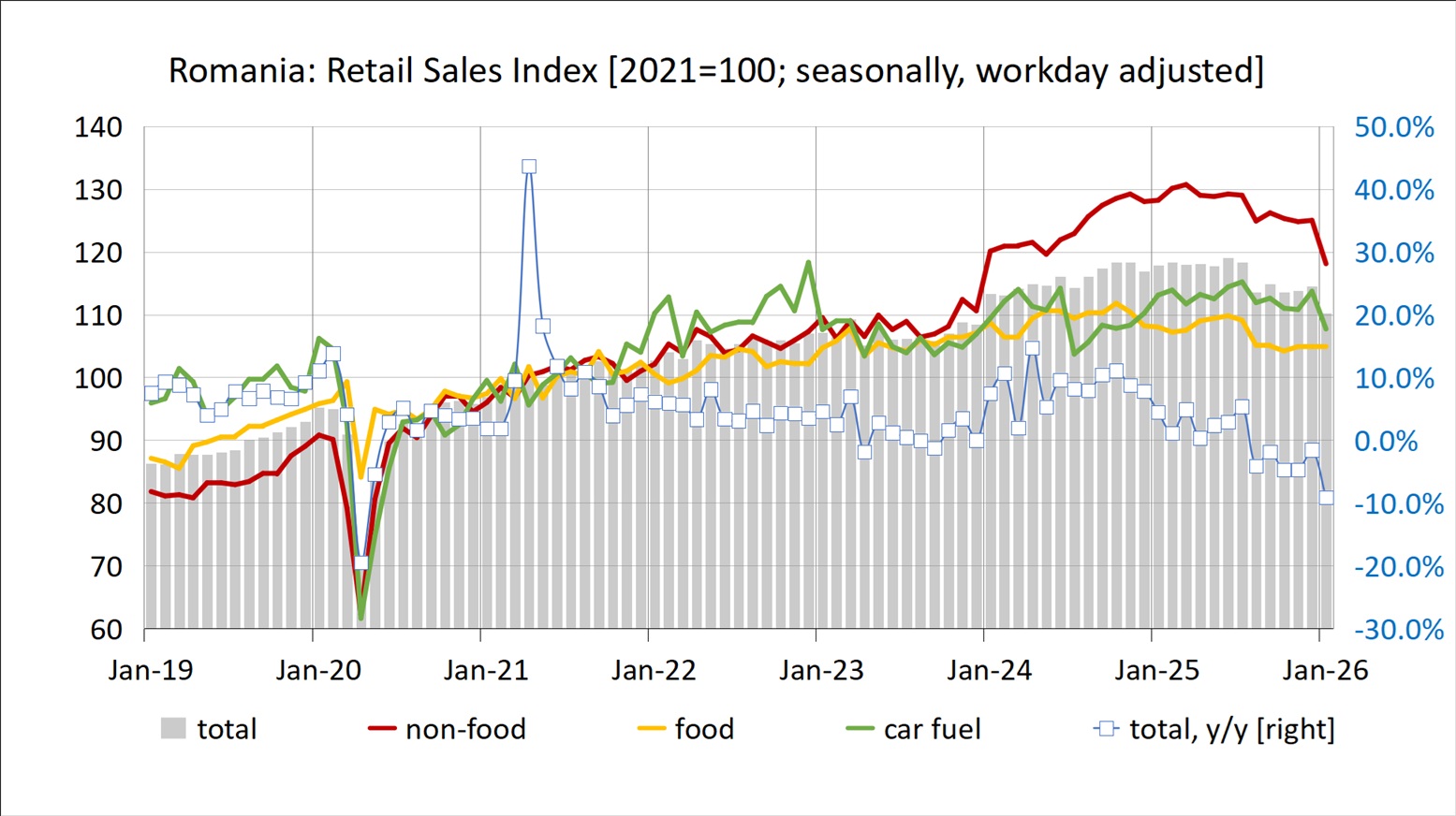 Retail sales volume in Romania (chart) fell by 9.1% y/y in January, according to data published by the statistics office INS, as households reduced spending amid rising energy bills, slower wage growth and a deteriorating outlook for several social groups. In 2025, the sales edged up a mere 0.2% y/y on average, with the annual growth rate entering the negative area in Q4 (-3.3% y/y).