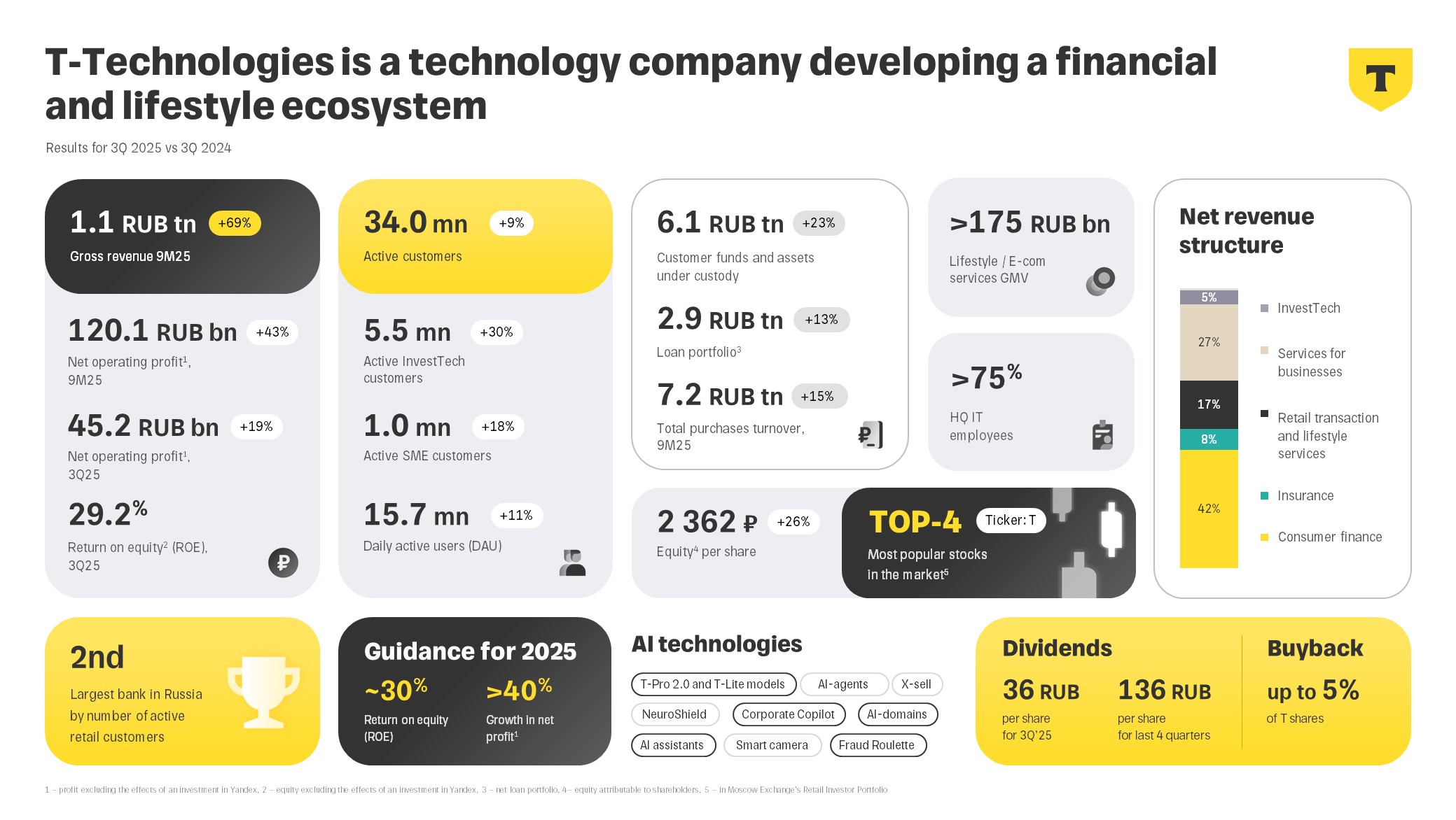 Founded in 2006, T-Technologies is a Russian technology company that develops an integrated financial and lifestyle ecosystem. It positions itself as a high-tech platform where users can manage their finances, shop, travel, invest, and access digital services, all within a unified ecosystem. Operations span a wide range of digital services, including: digital banking, brokerage and investment platforms, merchant acquiring solutions, and lifestyle and transactional services amongst other things.