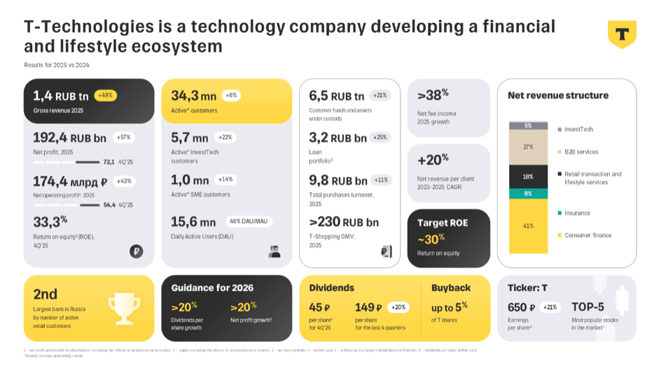 “We continue to strengthen our key operating and financial metrics. Today, T-Technologies represents RUB 1.4 tn in revenue, 54 mn customers and around 17% of the country’s retail turnover. In 2026, we are focused on sustaining high-quality growth across all key business segments, while maintaining an emphasis on efficiency and profitability, as well as strategic investments in technology, education and an outstanding customer experience.