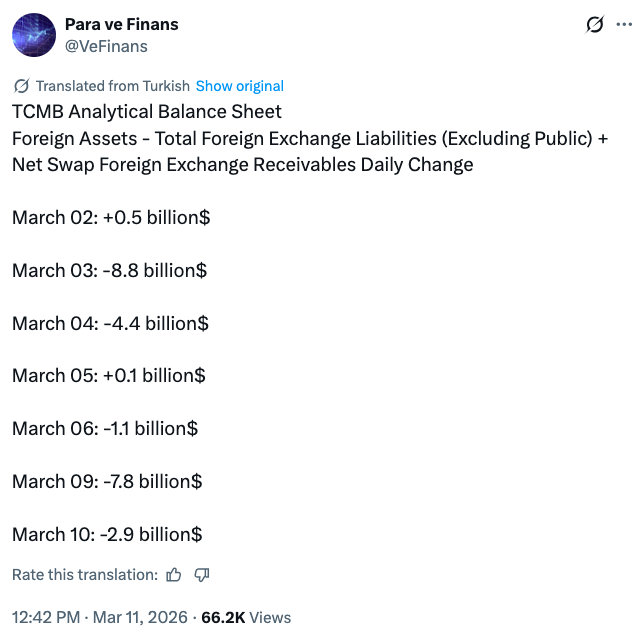 According to calculations by @VeFinans, the central bank’s net interventions in the currency market amounted to $22bn between March 2 and March 10, roughly the first week of its interventions.