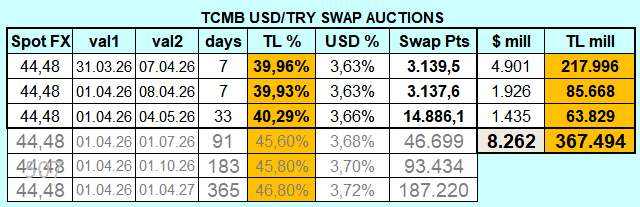 Table by @e507: Results of the central bank’s swap auctions held on March 31 and implied rates for longer maturities.