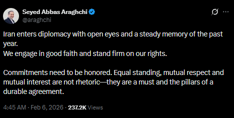 "Iran enters diplomacy with open eyes and a steady memory of the past year," Araghchi wrote on X ahead of the session. "Commitments need to be honoured. Equal standing, mutual respect and mutual interest are not rhetoric – they are a must and the pillars of a durable agreement," Araghchi wrote on his X account.