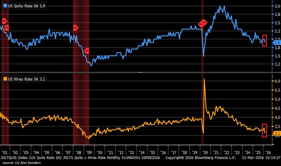 The US jobs market is under strain with the quits rate and hire rates down.
