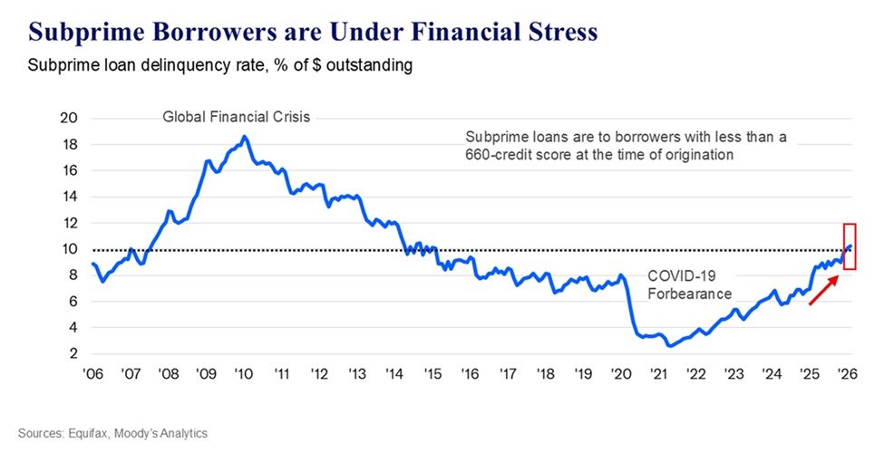 The delinquency rate on subprime loans has risen to 10% of total outstanding debt, marking its highest level in 11 years as more borrowers fall behind on repayments.