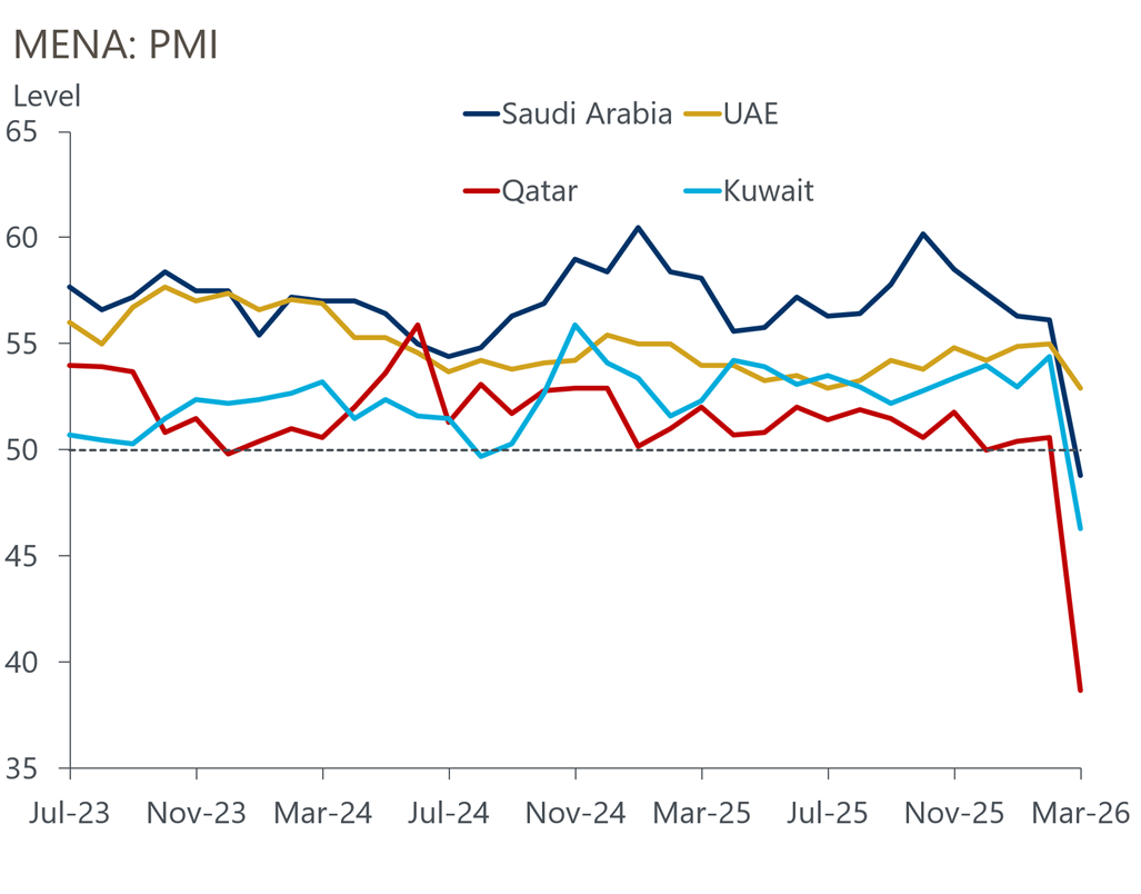 Business surveys suggest the economic impact of the conflict had already taken hold before the ceasefire. Purchasing managers’ index data for March showed sharp declines across much of the region, led by Qatar, where the PMI fell to 38.7 from 50.6, its lowest level since 2020. Saudi Arabia’s non-oil PMI dropped to 48.8, a more than five-year low, while Kuwait’s reading fell to 46.3 from 54.4.