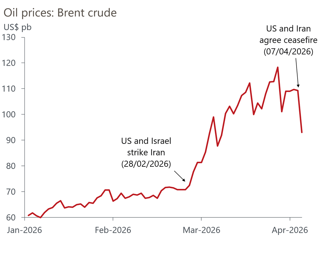 The two-week ceasefire agreement reached on April 7, includes a commitment by Iran to reopen the Strait of Hormuz ahead of further talks on April 10. Brent crude dropped more than 13% to about $93 per barrel following the announcement, slipping below $95 but remaining significantly above pre-war levels of around $65/bbl.