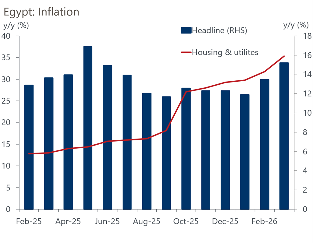 In Egypt, policymakers have opted for caution as inflationary pressures intensify. The Central Bank of Egypt held its overnight deposit rate at 19% and lending rate at 20%, citing heightened regional uncertainty. Annual urban inflation accelerated to 15.2% in March, up from 13.4% in February, driven largely by higher energy prices.